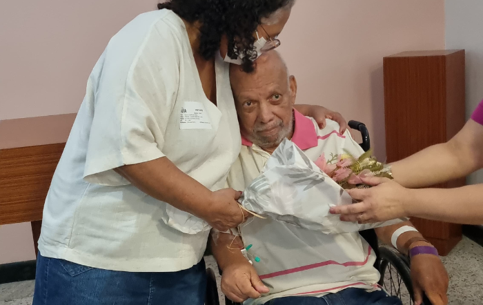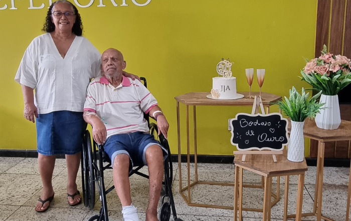 A celebração das bodas de ouro do casal, que contou com decoração especial e benção religiosa, foi organizada pela família do casal com apoio da equipe da unidade, onde Alfredo encontra-se internado desde o dia 12 de junho, sob cuidados da equipe multiprofissional da Geriatria.