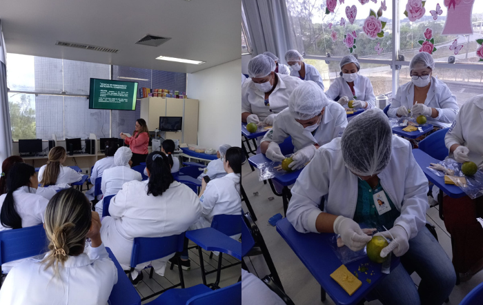 Além da aula teórica, houve um treinamento prático. Os profissionais puderam aplicar as técnicas em materiais que simulavam tipos de tecido: sabão em barra, pé de galinha e laranja. Após o treino, um Quiz foi aplicado para avaliar a compreensão do pessoal sobre o tema.