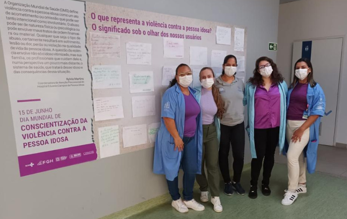Também aconteceram ações nas enfermarias e rodas de conversas com os profissionais. Além disso, ao longo de todo mês, a equipe segue atualizando o mural de desenhos que refletem o significado da violência sob a perspectiva dos pacientes e acompanhantes idosos.