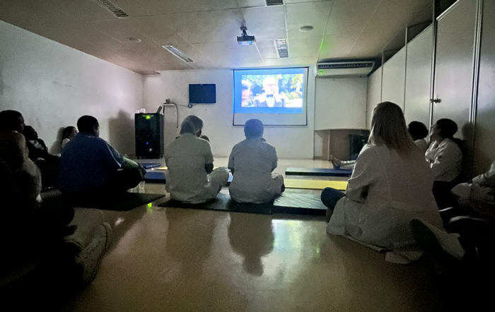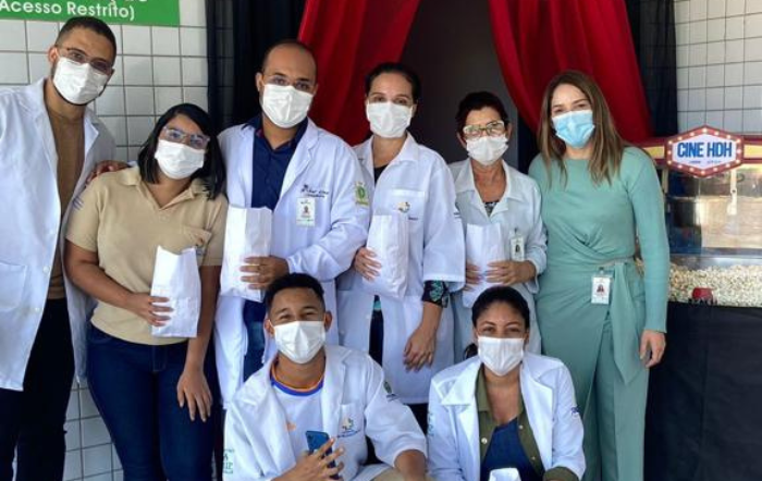 O auditório da unidade foi transformado em cinema para sair um pouco da atmosfera hospitalar. Para isso, o espaço foi ambientado com colchonetes pelo chão, foi feita distribuição de pipoca e refrigerante e colocado um tapete vermelho para que a equipe pudesse vivenciar a experiência de estar indo a um outro local.